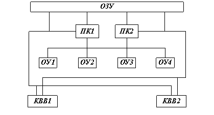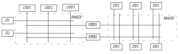 представлен МПВК, включающий в себя две матрицы: КМЦУ – матрицу для центральных устройств (процессоров, ОЗУ и каналов ввода – вывода) и КМПУ – матрицу для периферийных устройств. Схемы последней могут иметь существенно меньшее быстродействие, чем схемы первой, да к тому же обе коммутационные матрицы будут значительно проще и дешевле, чем одна общая коммутационная матрица с высоким быстродействием.