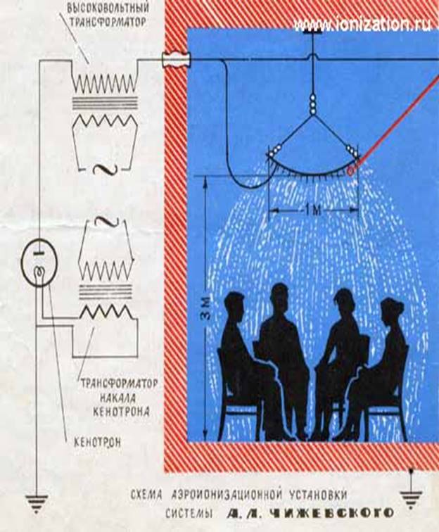 Авторские варианты аэроионизатора, разработанного Чижевским, использовали напряжение не менее 100 киловольт. Это необходимо, чтобы заряд мог пролететь 3-3,5 метра, и достичь земли. Процедура продолжалась не более 5 минут в сутки, иначе ядовитый озон мог сильно навредить пациенту. Пациенты находились строго под люстрой. Для нейтрализации избытка отрицательных аэроионов было необходимо заземление, что не позволяло накапливаться отрицательному заряду на окружающих предметах и заряжать пыль. Для того, чтобы избежать оседания и скопления заряжающейся пыли, в помещениях, где проводились сеансы аэроионизации, 2-3 раза в день делалась влажная уборка, до и после сеанса помещение обязательно проветривалось.