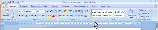 Главный элемент пользовательского интерфейса Microsoft Word 2007 представляет собой ленту, которая идет вдоль верхней части окна каждого приложения, вместо традиционных меню и панелей инструментов (рис. 1).
