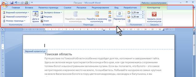 Рис. 5 Контекстная вкладка Работа с колонтитулами/Конструктор