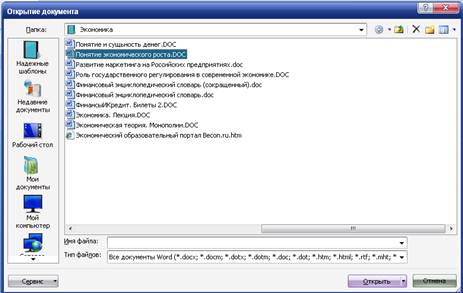 Для открытия недавно открывавшегося файла можно выбрать его в списке Последние документы