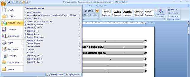 При открытии в Word 2007 документа, созданного в Word 2003, Word 2002 или Word 2000, автоматически включается режим совместимости, а в строке заголовка окна документа отображается надпись Режим ограниченной функциональности
