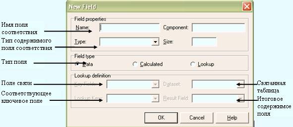 С помощью конструктора нового поля можно создать в НД новые поля одного из трех типов (тип определяется переключателями в группе Field type):