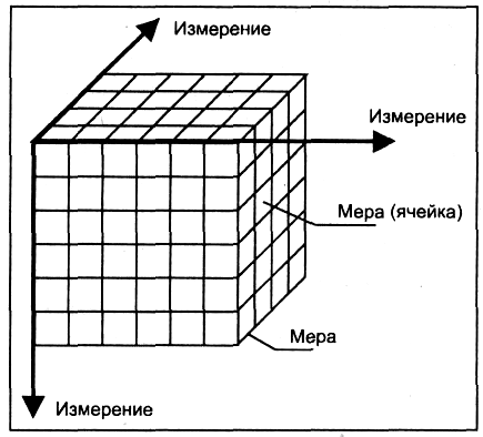 На пересечениях осей измерений располагаются данные, количественно характеризующие анализируемые факты, — меры, такие как издержки, остатки на складе или же объемы продаж, выраженные в единицах продукции или в денежном выражении и т. п.