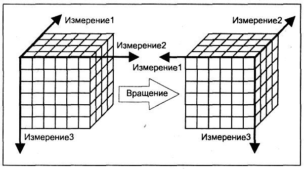 · Вращение (приложение 2) — изменение расположения измерений, представленных на отображаемой странице или же в отчете. Кроме того, вращением куба данных является перемещение внетабличных измерений на место измерений, представленных на отображаемой странице, и наоборот (при этом внетабличное измерение становится новым измерением строки или измерением столбца). В качестве примера для первого случая может служить такой отчет, для которого элементы измерения "Время" располагаются поперек экрана (являются заголовками столбцов таблицы), а элементы измерения "Продукция" — вдоль экрана (являются заголовками строк таблицы). После применения операции вращения отчет будет иметь следующий вид: элементы измерения "Продукция" будут расположены по горизонтали, а элементы измерения "Время" — по вертикали. Примером второго случая может служить преобразование отчета с измерениями "Меры" и "Продукция", расположенными по вертикали, и измерением "Время", расположенным по горизонтали, в отчет, у которого измерение "Меры" располагается по вертикали, а измерения "Время" и "Продукция" — по горизонтали. При этом элементы измерения "Время" располагаются над элементами измерения "Продукция". Для третьего случая применения операции вращения можно привести пример преобразования отчета с расположенным по горизонтали измерением "Время" и измерением "Продукция", расположенным по вертикали, в отчет, у которого по горизонтали представлено измерение "Время", а по вертикали — измерение "География" (синоним: Pivot).