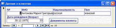 Макрос «Макрос 2» открывает таблицу в форме «Данные о клиентах». На этой форме я тоже установила кнопку «Документы о клиентах», и при нажатии на эту кнопку откроется таблица «Документы о клиентах».