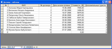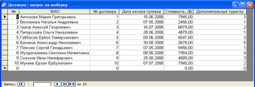 Отчет «Договора» выводит ФИО, номера договоров, стоимость, дополнительные туристы и даты начало путевки. Этот отчет ссылается на таблицу «Договора» (см. рис 47).