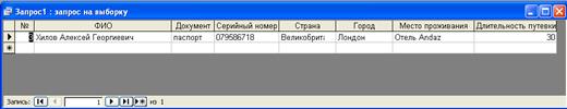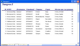 Отчет «Отчет 1» выводит ФИО, документ, серийный номер документов, страны и города, выбранные клиентами и длительность путевки (см. рис 48).