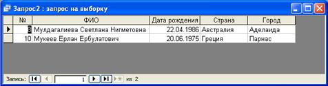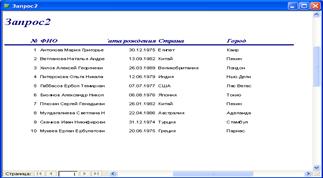 Отчет «Отчет 2» выводит ФИО, даты рождения, страны и города, куда они поедут отдыхать. Он ссылается на «Запрос 2» (см. рис 49).