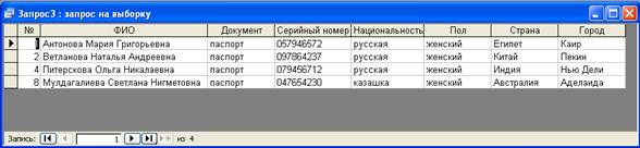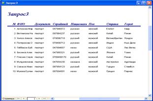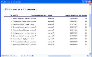 Отчет «Отчет3» выводит всю информацию о клиентах, т.е. их ФИО, какие у них документы и их серийный номер, национальность, пол, страны и города, куда они предпочитают поехать отдыхать (см. рис 50).
