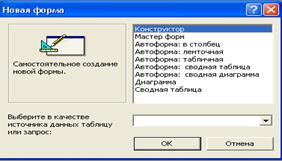 Отчет представляет собой эффективный способ представления данных в печатном формате. Имея возможность управлять размером и внешним видом всех элементов отчета, пользователь может отобразить сведения желаемым образом. Большая часть сведений в отчете поступает из базовой таблицы, запроса или инструкции SQL, являющейся источником данных для отчета. Остальные сведения отчета хранятся в его структуре. Наиболее удобным способом создания отчетов является создание отчета с помощью Мастера (см. рис 43).