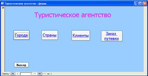 » есть кнопки: города, страны, клиенты, заказ путевки и выход. При нажатии по кнопке города