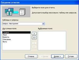 4. Выбрать таблицу или запрос, содержащие данные, на которых должен быть основан отчет. Microsoft Access по умолчанию использует эту таблицу или запрос как источник данных для отчета. Однако мастер позволяет изменить источник данных, а также выбрать поля из других таблиц или запросов.