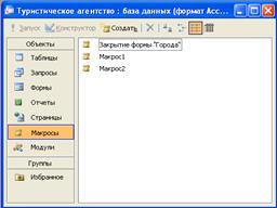 1. В окне базы данных выберите вкладку Макросы.2. Нажмите кнопку Создать.3. В ячейке столбца Макрокоманда нажмите кнопку раскрытия списка, открывающую список макрокоманд.4. Выберите имя макрокоманды.5. Введите текст комментария к макрокоманде (необязательно).6. В нижней половине окна, при необходимости, укажите аргументы макрокоманды. Для получения дополнительных сведений о задании аргументов макрокоманд нажмите кнопку.7. Для добавления в макрос других макрокоманд перейдите на следующую строку и повторите шаги с 3 по 6. Макрокоманды выполняются в порядке их расположения в бланке.Теперь опишу макросы, которые есть в базе данных. Их всего три: «Закрытие формы Города», «Макрос 1» и «Макрос 2» (см. рис 51)