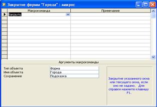 Рис 52. Макрос «Закрытие формы Города» в режиме Конструктора