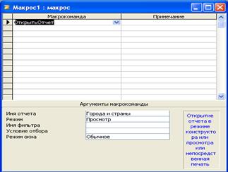 Макрос «Макрос 1» открывает отчет «Города и страны» на форме «Города и страны». На форме «Города и страны» я установила кнопку «Отчет», и при нажатии на неё откроется отчет «Города и страны» (см. рис 54).