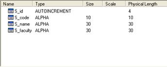 · A – (ALPHA) строковый тип данных, за которым в поле SIZE указывается количество символов допустимых в строке;