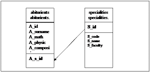 В таблице abiturients создан вторичный индекс по полю A_s_id. По этому полю осуществляется связь с таблицей specialities (см. рис. 3).