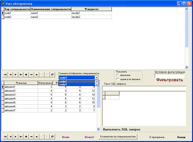 Второе событие - onCloseUp – происходит, когда пользователь выбрал нужную специальность из списка и список закрывается. В обработчике этого события восстанавливается связь между главной и подчиненной таблицами. И снова можно перемещаться по строкам таблицы специальностей и смотреть абитуриентов по каждой из них (см. рис. 5).