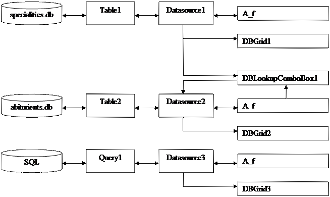 В программе нет никаких связей заданных по умолчанию. Вместо этого на форме находится DBLookupComboBox, который связал поля s_id и a_s_id и в то же время ссылается на поле s_id. Если эти поля связать между собой в конструкторе связей, база данных будет выдавать ошибку, поскольку BDE полагает, что поле s_id связано само с собой. А если не связать, то программа не будет отображать отдельно записи абитуриентов по разным специальностям, а будет отображать все подряд. Программой обрабатываются два события связанные с DBLookupComboBox. Это onEnter и onCloseUp.