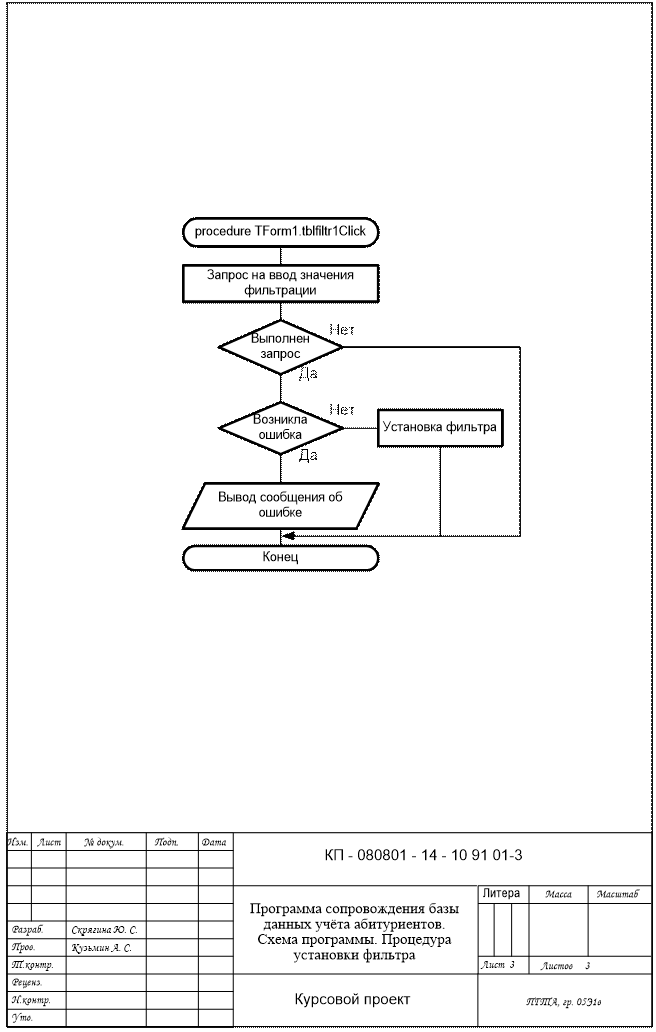 Когда пользователь начинает выбор специальности из списка, то происходит событие onEnter, программа выполняет программный разрыв связи между таблицами, и поэтому во время раскрытия списка в таблицах сетки отображаются все записи абитуриентов. Зато, благодаря отсутствию связи можно выбрать любую специальность из списка, а не только ту, абитуриенты которой отображаются в данный момент на экране (см. рис. 4).