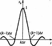 Из этого соотношения следует, что непрерывная функция u(t) действительно определяется совокупностью ее дискретных значений амплитуды в отсчетные моменты времени , что и доказывает теорему Котельникова. Простейшие сигналы вида ортогональные друг другу на интервале времени - , , называются функциями отсчетов, базисными функциями, или функциями Котельникова. График k-й функции Котельникова представлен на рис. 2. Каждая из базисных функций sk