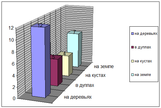 5. Число видов, гнездящихся на земле в плодовых садах не велико и составляет—22,2%. Это связано с агротехнической обработкой почвы в садах, в следствие чего большинство гнездящихся на земле птиц не имеют условий, необходимых для маскировки гнезда и защиты его от врагов.