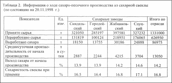 В Республике Беларусь сахарная свекла возделывается на площади 45-50 тыс. га. Средняя урожайность за последние пятилетние периоды составляла от 200 до 300 ц/га, а в 1998 году по республике получена урожайность 296 ц/га (табл. 1). Заводской выход, сахара на 20.11.1998 г. по четырем сахарным заводам составил 14.2 %, что близко к европейскому уровню, но в западноевропейских странах урожайность достигает 550 ц/га (табл. 2).