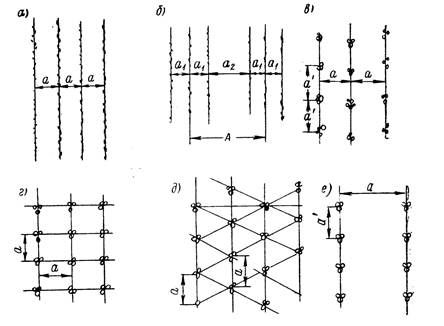 и прямоугольногнездовую схему посева (посадки). Размещение гнезд (или отдельных растений) по вершинам квадратов (прямоугольников) дает возможность проводить механизированный уход за посевами и посадками в двух взаимно перпендикулярных направлениях, что является основным достоинством указанных способов. Разновидностью квадратно-гнездового посева является шахматный посев (рис. 1, д),