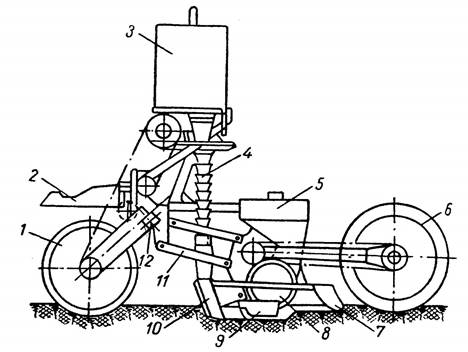 При движении агрегата по полю опорно-приводное колесо посредством механизма привода вращает диски высевающих аппаратов для семян и удобрений. Семена из ячеек высевающего диска сбрасываются клиновыми выталкивателями на уплотненное дно борозды, нарезанной сошником. Удобрения по тукопроводам ссыпаются в переднюю часть полозовидного сошника с открылком, нарезающим борозду для удобрений. Таким образом удобрения размещаются сбоку от семян с прослойкой земли. Подпружиненные отвальные загортачи закрывают их почвой, а прикатывающие катки /уплотняют почву над бороздами. Шлейфы б выравнивают рельеф поля за сошником и покрывают рядки мульчирующим слоем почвы.