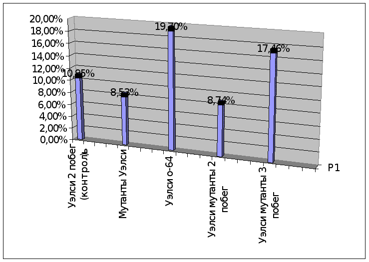Ошибка опыта: Sx=0,811666 Xc=0,476875 Sd=0,1147869 НСР-05=0,236461 Анализируя данную таблицу можно сделать выводы, что форма сорта Ренет Черненко О-43 превосходит контроль на 3,56% (0,19г.), но это является несущественной разницей, поэтому ее преимущества не могут считаться значимыми, но следует обратить внимание на эту форму в дальнейшем, т. к. результат может измениться. Остальные формы в большей или меньшей степени уступают контролю. Худший результат показала форма Ренет Черненко о-35 в-2 (49,4%), что превышает контрольное значение приблизительно в 3 раза. Таблица 5.Сравнение потери влаги сорта Уэлси с его мутантными и гибридными формами.
