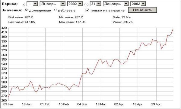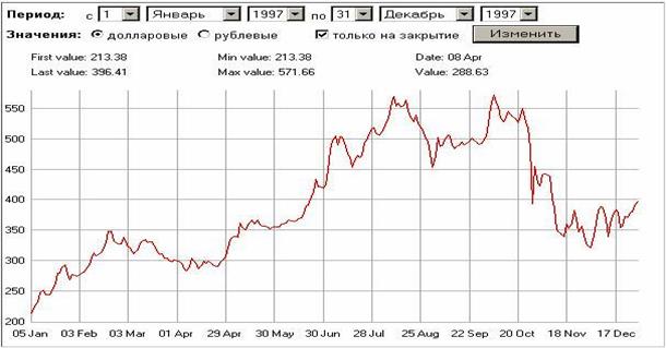 Индекс РТС - официальный индикатор Фондовой Биржи РТС (крупнейшей и наиболее активно используемой в России электронной биржевой площадки, на долю которой приходится около половины от общего объема торгов на российском фондовом рынке), впервые был рассчитан 1 сентября 1995 года и на сегодняшний день является основным показателем развития российского фондового рынка. Индекс рассчитывается каждые полчаса в течение всей торговой сессии на основании данных о сделках, заключенных в РТС с наиболее ликвидными акциями. Индекс РТС обновляется в режиме реального времени и публикуется на WEB-сервере РТС. - < http://www.rts.ru/rts>