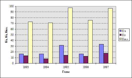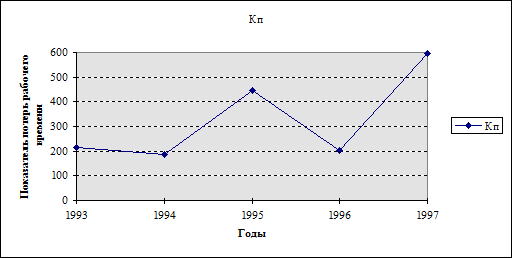 Одним из показателей, наиболее полно характеризующих состояние травматизма на предприятии, является показатель потерь рабочего времени, который в 1997 году также имел наибольшее значение - 596,6. Число заболеваний в год в хозяйстве за анализируемый период возросло. Об этом говорит показатель интенсивности заболеваний. Так в 1997 году он составил 96,6, однако наивысшее значение этот показатель имел в 1995 году - 97,5.