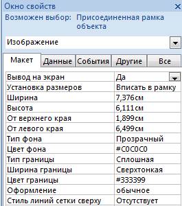 В нашей форме «Товары» есть поле объекта OLE для размещения изображений товаров. В свойствах этого поля, на вкладке «Макет» устанавливаем размеры: «Вписать в рамку» (см. рис. 15). Это позволит вставлять изображения любых размеров – Access автоматически подгонит картинку под размер поля.