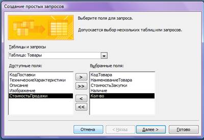 Создадим запросы на наличие и отсутствие товара. Для создания запроса необходимо открыть вкладку «Запросы» окна базы данных, нажать кнопку создать и в появившемся окне выбрать «Простой запрос». В этом случае будет предложено указать список таблиц и их полей. Выбираем таблицу «Товары», добавляем необходимые поля (см. рис. 17), нажимаем кнопку «Далее». На основании этих данных будет создан запрос.