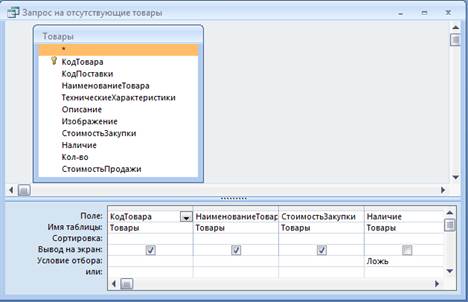 При выполнении запроса (значок на панели управления) появится таблица товаров в наличии или отсутствующих в зависимости от запроса (см. рис. 20).