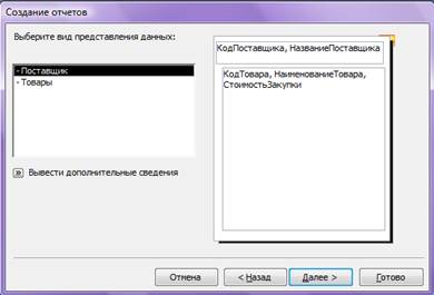 Выбрать поля для отчета из имеющихся источников как мы это делали при создании форм и запросов. Выбираем вид представления данных (см. рис. 24), нажимаем «Далее».