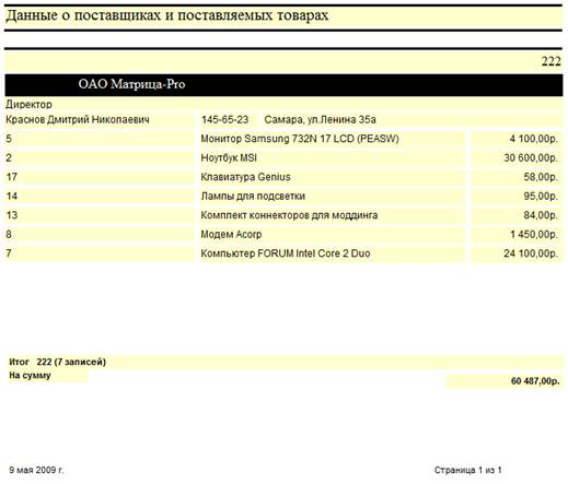 В режиме формы вычисляет стоимость товара с наценкой магазина в 50%. Реализует запросы упорядочения по полям: товары, поставщики, цена. Осуществляет поиск сведений о фирме - поставщике какого - то товара. Производит подсчет стоимости и количества оставшегося в магазине товара, а также выдает отчет об отсутствующих товарах.