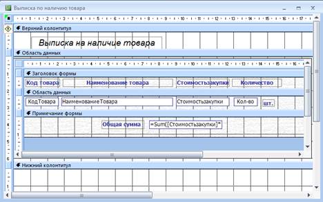 На панели элементов выбираем значок «Надпись» и вставляем элемент надписи в верхний колонтитул отчета. Называем «Выписка на наличие товара» (см. рис. 29).