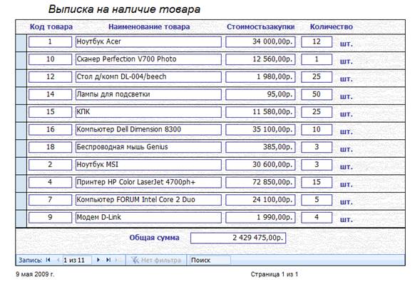 Теперь отчет готов. Сохраняем его под именем «Выписка на наличие товара (см. рис. 33).