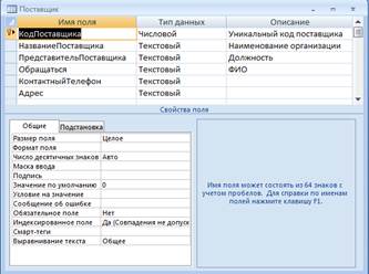 Каждая таблица содержит информацию на отдельную тему, а каждое поле в таблице содержит отдельные сведения по теме таблицы. Например, в таблице с данными о поставщиках могут содержаться поля с названием компании, адресом и номером телефона. При разработке полей для каждой таблицы необходимо помнить: