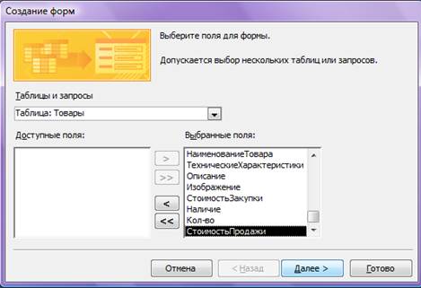 Рис. 12 Создание формы в режиме мастера, нармы к другим таблицам нашей базы данныхвыбор полей для формы