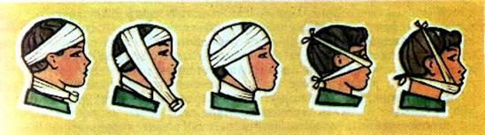 . Для этого берут бинт или полоску материи, оба конца надрезают, оставляя целой среднюю часть. Наложив среднюю часть на нос или подбородок, концы перекрещивают и нижние завязывают на темени, проведя их, впереди ушей, а верхние — на затылке. Аналогичная повязка делается и при перевязке раны на затылке или темени.