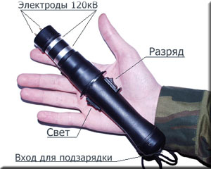 В основном все электрошоковые устройства “западного производства” однотипны с одинаковым принципом действия. Питание осуществляется от батареи 9 вольт “Крона”, или двух батарей. Подразделяются они по мощности выходного заряда. Противника поражает электрический удар напряжением примерно 40000, 80000, 100000 и т.д. вольт, однако сила тока очень мала, для того, чтобы убить, всего 0,6 мА. Этого достаточно, что бы парализовать нервно-мышечную реакцию, и вывести из строя противника.