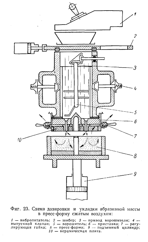Абразивные изделия заданной геометрической формы и объемного веса изготовляются формованием. В большинстве случаев это достигается за счет прессования абразивных изделий в специальных пресс-формах на прессах различной конструкции. Процесс формования состоит из ряда технологических операций, выполняемых последовательно или параллельно при помощи специальных механизмов и устройств. Главнейшие из этих операций следующие: дозировка абразивной массы, укладка ее в пресс-форму, прессование, выталкивание изделия и укладка его на сушильную плиту, очистка и смазка пресс-формы, а также транспортные операции. Все эти операции выполняются специальными механизмами.