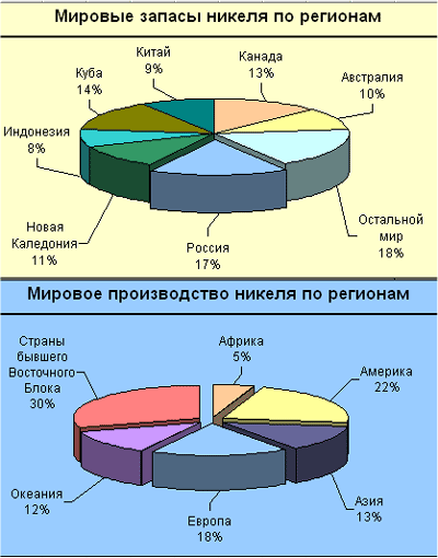 На начало 1998 г. подтвержденные мировые запасы никеля составляли около 50 млн. т. Запасами более 1 млн. т никеля обладало десять стран: Канада (7.4 млн. т), Россия (6.6 млн. т), Куба (5.5 млн. т), Новая Каледония (5.2 млн. т), Австралия (3.7 млн. т), Китай (3.7 млн. т), Индонезия (3.2 млн. т), ЮАР ( 2.5 млн. т), Филиппины (1.1 млн. т) и Албания (1 млн. т). В Канаде, России, Китае и ЮАР от 90 до 100% никеля заключено в сульфидных месторождениях, в Австралии на них приходится около 50% запасов. В пяти остальных странах запасы никеля связаны с латеритными месторождениями. Добыча никелевых и никельсодержащих руд осуществляется более чем в 20 странах мира. Наибольшие объемы горнорудной никелевой продукции из года в год производятся в России (235 тыс. т никеля в пересчете на металл, или 21.9% мирового производства в 1997 г.), Канаде (190.5 тыс. т – 17.8%), Новой Каледонии (137.1 тыс. т – 12.8%), Австралии (123.4 тыс. т – 11.5%), Индонезии (71.1 тыс. т – 6.6%), на Кубе (61.5 тыс. т – 5.7%) и в Китае (46.7 тыс.т – 4.4%).