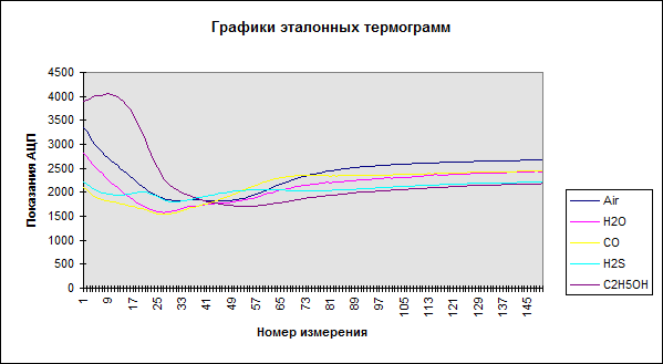 Для настройки датчика используются тарированные газовые растворы паров различных веществ в воздухе. Первоначально испытания датчика проводились на 20 эталонных образцах.