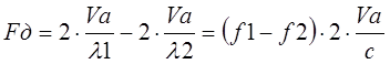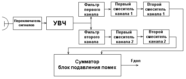 Сигналы с выходов каналов складываются в сумматоре, где выделяется частота биения Fб = Fдоп = Fd1 – Fd2. Следовательно:
