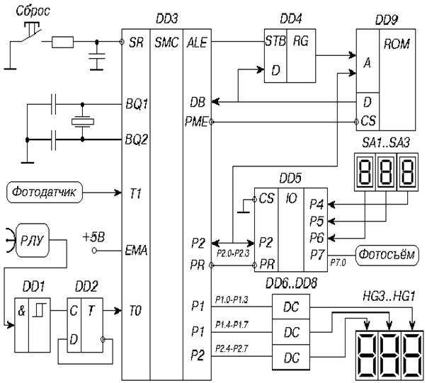 Устройство можно спроектировать с применением однокристального микроконтроллера семейства МК48. Микросхемы семейств МК48 и МК51 получили наибольшее распространение среди микросхем такого класса. Использование микросхемы DD3 К1830ВЕ35 в данном случае - самый экономичный вариант реализации устройства. Функциональная схема устройства изображена на рисунке 3.4. Прикладную программу можно разместить во внешней памяти программ - микросхеме DD9 ПЗУ К556РТ5. Адрес очередной ячейки ПЗУ фиксируется во внешнем регистре DD4. Микроконтроллер содержит на кристалле три 8-разрядных порта. Линии порта P1 и линии P2.4-P2.7 используются для трёхразрядной индикации скорости (км/ч). Для индикации можно использовать тройку светодиодных семисегментных цифровых индикаторов HG1..HG3, например, типа АЛС324А. Индикаторы подключаются к портам микроконтроллера через дешифраторы DD6..DD8 (514ИД1), преобразующие двоично-десятичное содержимое портов в коды управления цифровыми индикаторами.