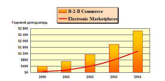 Мережа Інтернет представляє унікальні можливості для здійснення операцій продажу і придбання товарів і послуг, і ці можливості можуть значно розширитися у міру розвитку унікальних провідників електронного бізнесу – торгівельних майданчиків. Дані компанії Forrester| Research показують об перспективи зростання обороту систем класу B2B і збільшення відносної частки електронних торгівельних майданчиків в цьому обороті (рис. 2.1).